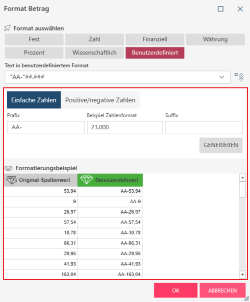 Um positive Zahlen, negative Zahlen und Nullen zu formatieren, stellen Sie sicher, dass die Registerkarte Positive/negative Zahlen ausgewählt ist. Geben Sie dann ein Formatbeispiel und den gewünschten Präfix und/oder Suffix für die positiven, negativen Zahlen und Nullen an. Klicken Sie auf die Schaltfläche Generieren, um ein Beispiel der Zahlen mit der ausgewählten Formatierung anzuzeigen. Beachten Sie, dass die Schaltfläche „Generieren“ deaktiviert ist, wenn kein benutzerdefiniertes Format für einen bestimmten Zahlentyp (positiv, negativ und Null) angegeben wurde oder wenn alphabetische Zeichen oder Sonderzeichen in eines der Felder für das Zahlenformat-Beispiel auf dieser Registerkarte eingegeben werden.