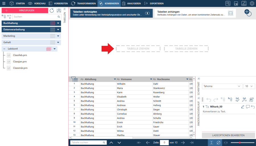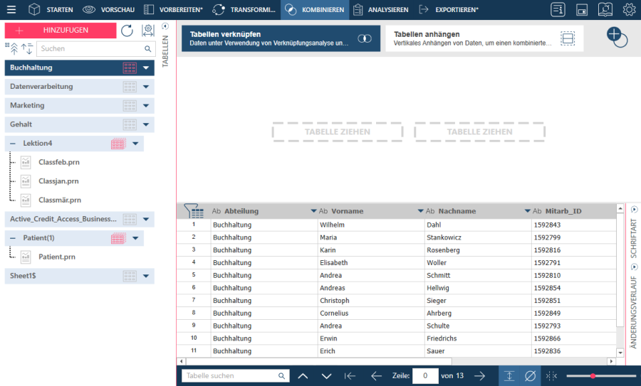 Die Phase „Kombinieren“ ermöglicht das Erstellen von Verknüpfungen zweier Tabellen in einer einzigen Verknüpfungssitzung. Verknüpfen Sie zwei oder mehr Tabellen, wenn Sie die Datensätze der beiden Tabellen zu einer Tabelle zusammenfassen möchten. Verknüpfungen ermöglichen das Konsolidieren von Daten und damit einen umfassenderen Überblick über die darin enthaltenen Informationen.