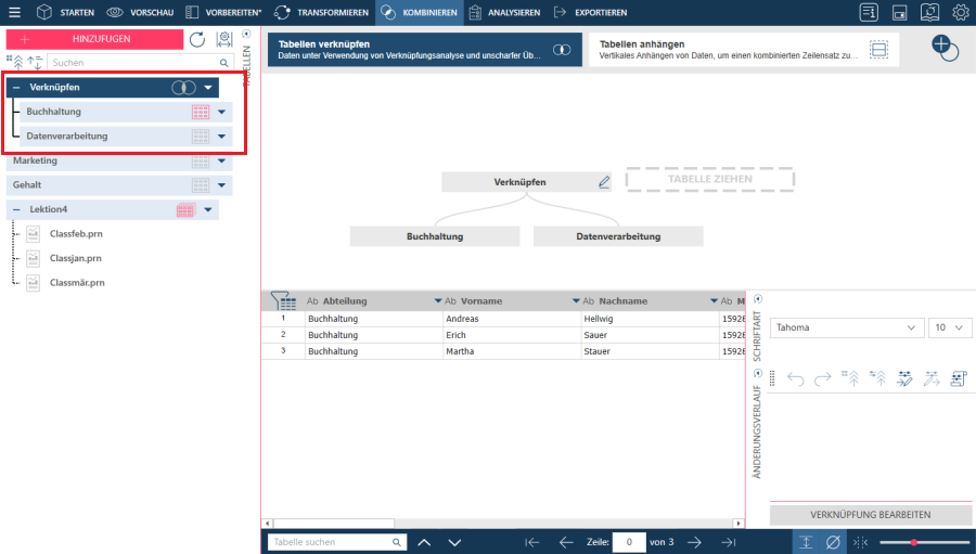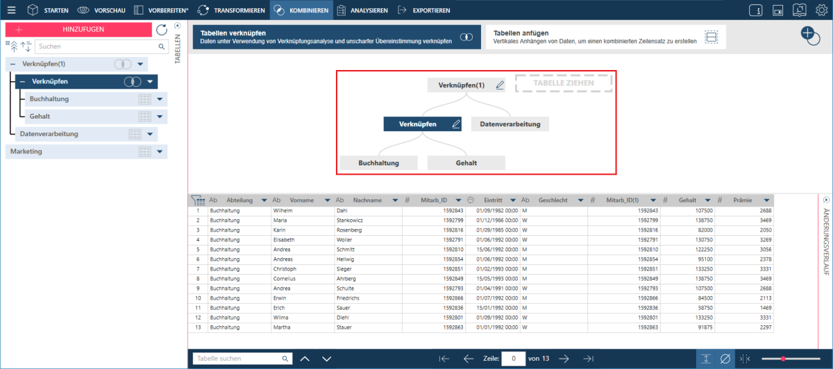 Klicken Sie nach dem Laden der Daten in das Fenster Vorbereiten auf Kombinieren > Verknüpfen, um die Verknüpfungsphase zu aktivieren.