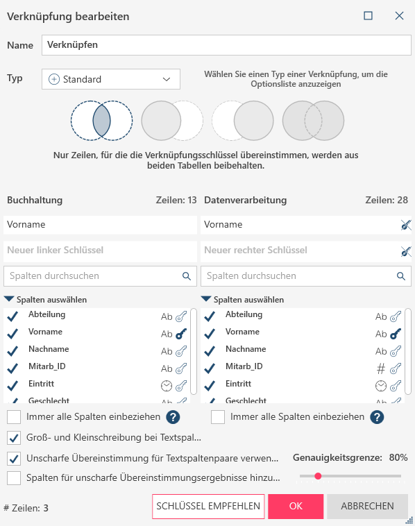 Beachten Sie bitte, dass unscharfe Verknüpfungen nur bei Schlüsselwerten mit dem Datentyp „Text“ funktionieren.