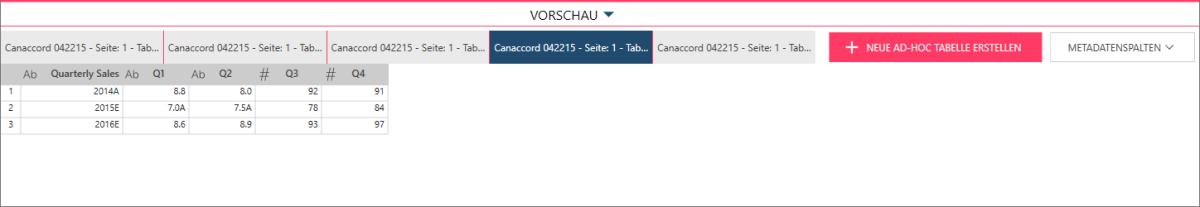 Sie können Ad-Hoc Tabellen im Fensterbereich „Tabelle“ definieren. Ad-Hoc Tabellen sind Tabellen, deren Eigenschaften und Werte Sie spontan definieren.