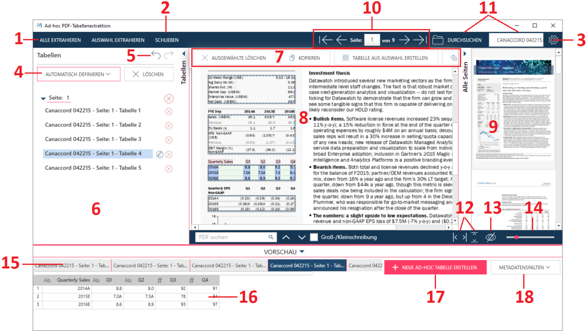 Vorschau der Dokumentenseiten Zeigt die aktuelle Seite des Dokuments an. Hier können Sie eine Seite und ihre Tabellen anzeigen. Gehen Sie zu einer anderen Seite, indem Sie die Seitenminiaturen (siehe Element 9) und Seitennavigatoren (siehe Element 10) verwenden. Einzelheiten finden Sie unter Ihr Dokument öffnen und damit arbeiten. |