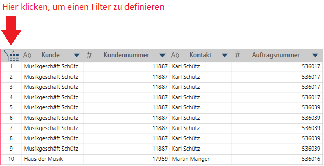Wenn Ihre Tabelle besonders breit ist, können Sie mit dem Spaltenfilter-Steuerelement nach bestimmten Spalten filtern. |
