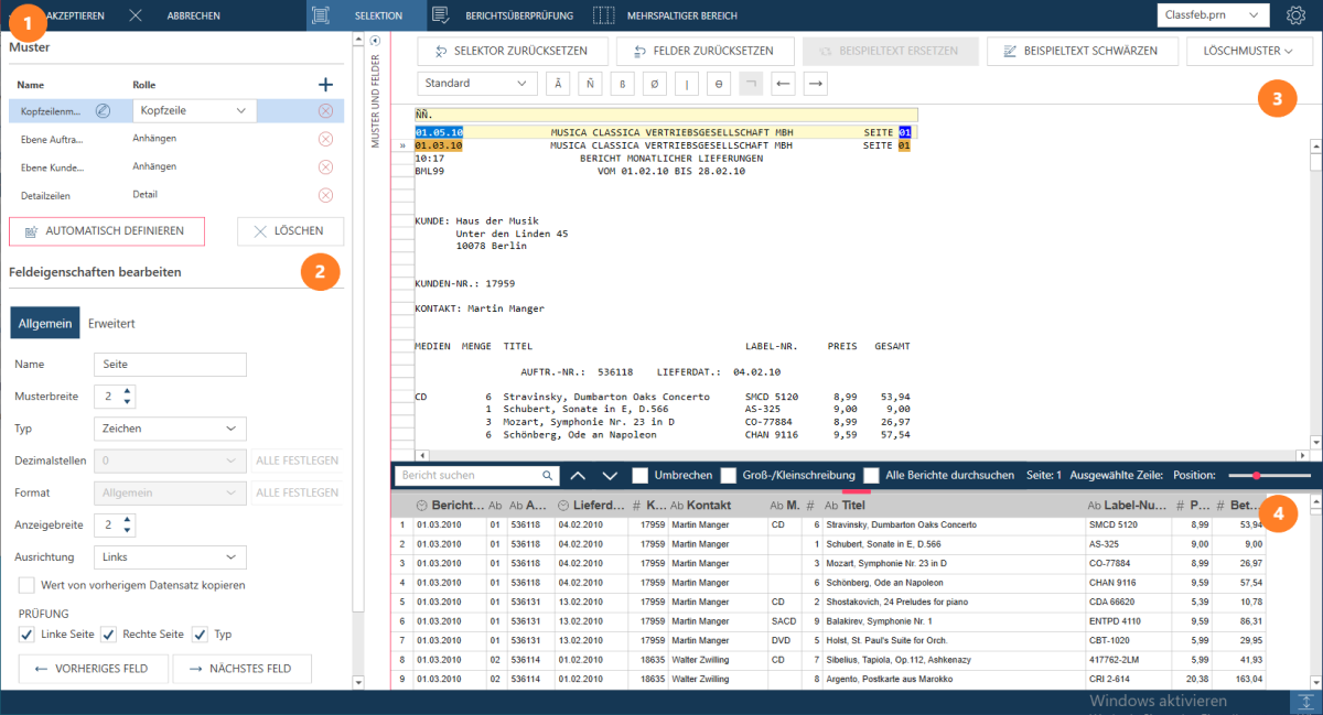 Das Fenster „Berichtsentwurf“ wird geöffnet, wenn Sie eine PDF-Datei oder ein Berichtdokument als Datenquelle Ihrer Data Prep Studio-Sitzung hinzufügen. In diesem Fenster können Sie bestimmte Felder eines Berichts auswählen, die mit Erfassen in einer Tabelle aufgenommen werden. Die resultierende Tabelle ist dann im Fenster Vorschau verfügbar.