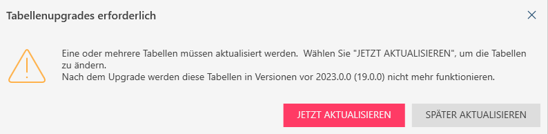 Wenn Sie Später aktualisieren wählen, wird der Arbeitsbereich geöffnet, aber die folgende Warnung wird im Tabellenselektor angezeigt:
