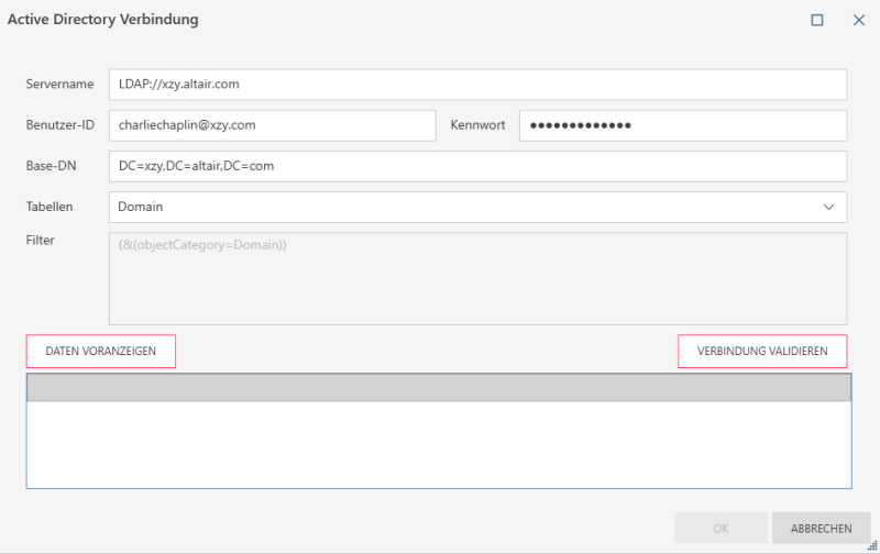 - Überprüfen Sie, ob die Verbindungseinstellungen und der Tabellenname korrekt sind. Sie können die Verbindung testen, indem Sie auf die Schaltfläche Verbindung validieren klicken und eine Vorschau der Tabelle durch Klicken auf Datenvorschau anzeigen. Je nach Connector können Sie auch die Einstellungen für Tabellen und Ansichten und Abfrage ändern. Klicken Sie auf OK, wenn Sie fertig sind.