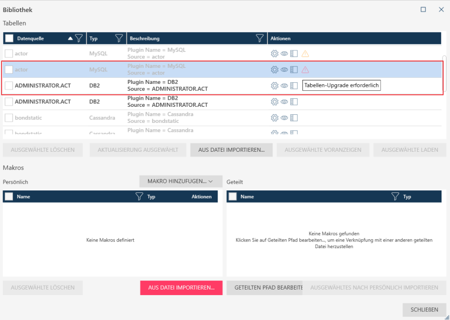Veraltete Tabellen in Bibliotheksdateien können auf die gleiche Weise wie oben beschrieben aktualisiert werden. Wenn Ihre Bibliotheksdatei veraltete Tabellen enthält, wird die folgende Warnung angezeigt: