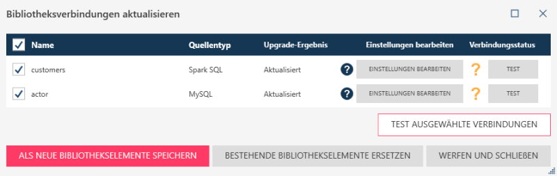 Nach der Aktualisierung können Sie die Tabellen als neue Bibliothekselemente speichern oder die vorhandenen Bibliothekselemente ersetzen.