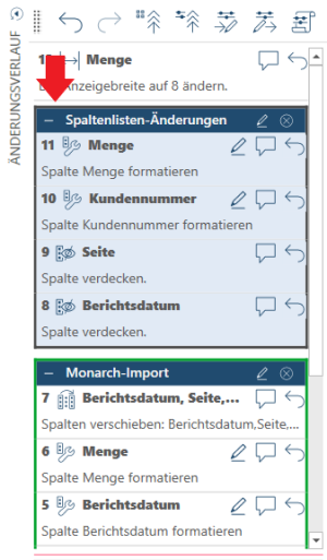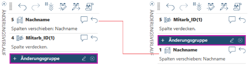 Mehrere auf eine Spalte angewendeten Änderungen oder die mehrfache Anwendung der gleichen Änderung können gruppiert werden, um zu verhindern, dass die Änderungsverlaufliste überlang wird.
