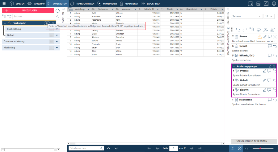 In Data Prep Studio kann die Reihenfolge der Änderungen in der Änderungsverlaufliste beliebig modifiziert werden.