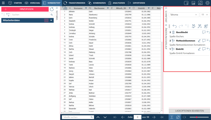 Ein Änderungsverlauf kann in einen Arbeitsbereich importiert werden. Nach dem Importieren werden die Änderungen auf die aktive Tabelle im Fenster Vorbereiten angewendet.