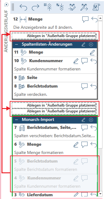 Alternativ können Sie eine oder mehrere Änderungen auswählen, die aus der Gruppe entfernt werden sollen, sie an eine andere Stelle in der Änderungsverlaufliste ziehen und dort ablegen.