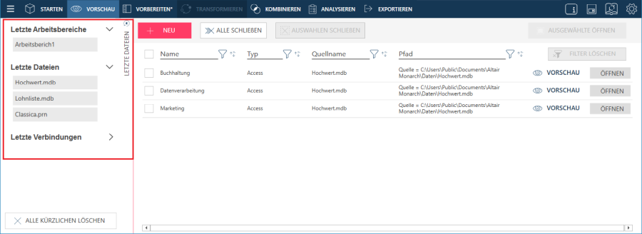 Die Auswahl eines der Elemente aus den Listen „Letzte Dateien“, „Letzte Datenquellen“ oder „Letzte Verbindungen“ öffnet das betreffende Element und lädt es in das Vorschaufenster. Von dort können sie wie gewöhnlich ausgewählt und in das Fenster „Vorbereiten“ geladen werden.