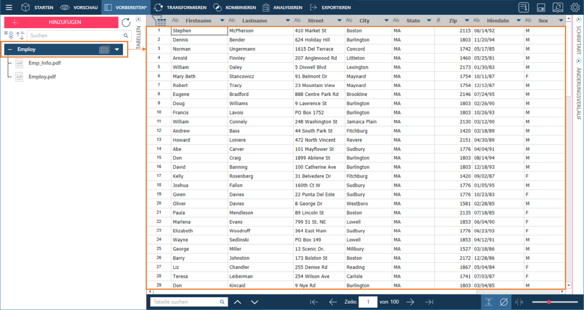 Wenn Sie auf den übergeordneten Knoten klicken, wird der Fensterbereich „Datenvorschau“ angezeigt. Im Fensterbereich „Datenvorschau“ können Sie die Daten in Ihren Tabellen visuell bestätigen.