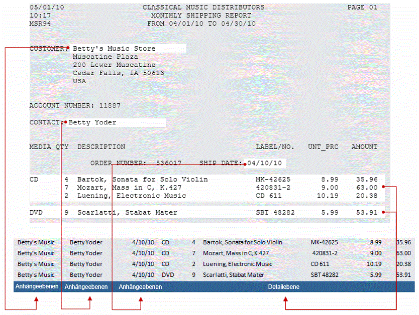 Die mit Hilfe eines Anhängemusters extrahierten Felder sind mit dem Detaildatensatz verknüpft, sofern die Anhängeebene irgendwo in oder vor der ersten Detailzeile beginnt. Die extrahierten Feldwerte werden dann im Bericht bis zur nächsten Okkurrenz des Anhängefelds an alle nachfolgenden Detaildatensätze angehängt. In der vorstehenden Abbildung wird z. B. für jede Transaktion ein separater Datensatz erstellt. Die Felder für Kundennamen, Kontaktperson und Lieferdatum, die mittels Anhängemuster extrahiert werden, sind mit allen vier Datensätzen verknüpft.