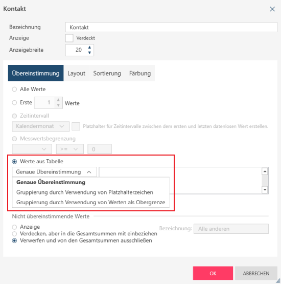 Gruppierung durch Verwendung von Platzhalterzeichen funktioniert so ähnlich wie „Genaue Übereinstimmung“, aber die berücksichtigten Schlüsselwerte können mit Platzhalterzeichen angegeben werden. Auf diese Weise müssen nicht alle Werte exakt eingegeben werden.