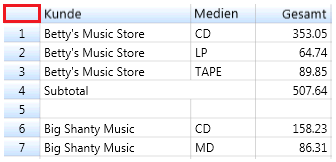 Datensätzen (Zeilen) auswählen: Zur Auswahl eines Datensatzes klicken Sie auf den Reihenmarker am linken Rand des Datensatzes. Um mehrere Datensätze auszuwählen, klicken Sie auf den Reihenmarker am linken Rand des ersten Datensatzes und ziehen die Maus nach oben bzw. unten, um die Auswahl zu markieren. Zur Auswahl von mehreren nicht zusammenhängenden Datensätzen klicken Sie auf den Reihenmarker und ziehen die Maus dann bei gedrückter Maustaste nach oben oder unten, um einen Datensatzbereich auszuwählen. Lassen Sie danach die Maustaste los. Halten Sie die STRG-Taste gedrückt, während Sie diesen Auswahlvorgang für weitere Datensätze wiederholen.