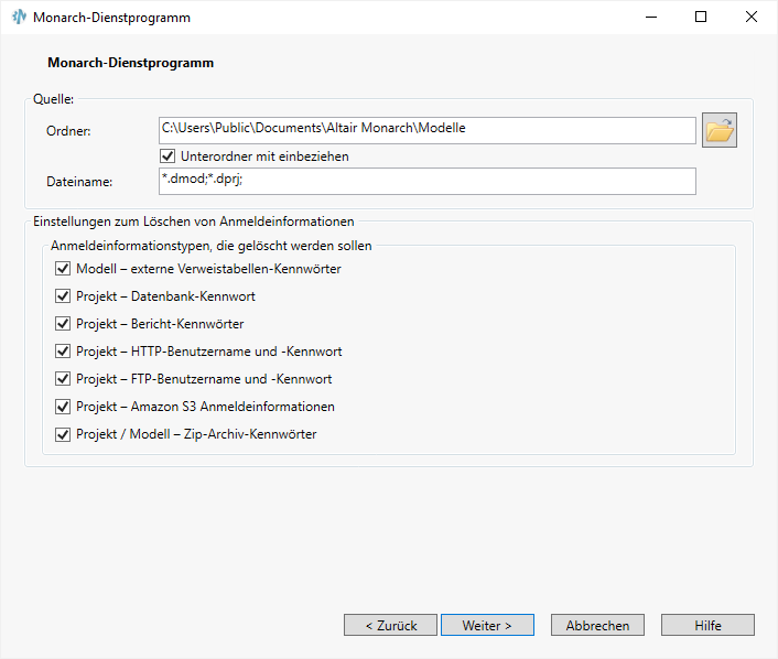 Ähnlich wie in den Fällen für Arbeitsbereiche in Data Prep Studio können die in Monarch Classic verwendeten Projekte und Modelle Anmeldeinformationen enthalten, die Zugriff auf verschiedene Datenquellen gestatten. Das Monarch-Dienstprogramm kann auch diese Anmeldeinformationen entfernen.