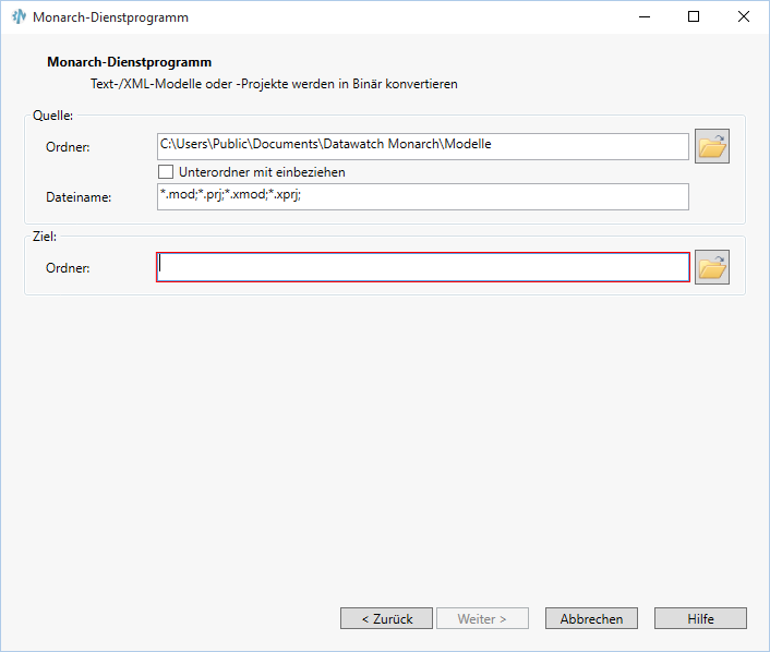 Das Monarch-Dienstprogramm bietet eine Methode zum Konvertieren der alten Modell- und Projektformate (d. h. xmod, xprj) in die Formate .dmod und .dprj, ohne dass jedes Modell und Projekt in Monarch geöffnet werden muss. Dies beschleunigt die Datenverarbeitung.