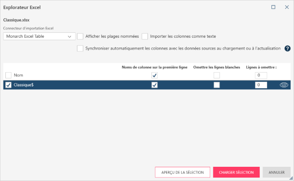 Pour appliquer ces spécifications, sélectionnez le nom d’une table à ouvrir dans la colonne la plus à gauche de la boîte de dialogue. Si vous désirez ouvrir toutes les tables comprises dans le fichier Excel cochez la case Nom de la table. Vous pouvez alors cocher les cases correspondant à chacune des options décrites ci-dessous par table. Cliquez sur l’icône d’aperçu à droite de chaque nom de table pour voir un aperçu de la table qui sera chargée.