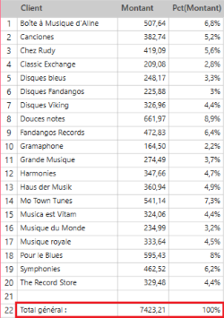 Les lignes de sous-totaux s’ajoutent lorsque la valeur du champ-clé change. Dans l’illustration ci-dessous, les lignes de sous-totaux s’ajoutent chaque fois que la valeur du champ-clé Client change.
