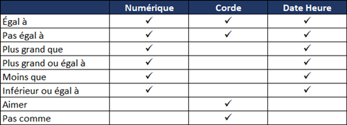 Remarquez que toutes les valeurs de chaîne doivent s’accompagner du signe %. Par exemple, pour qu’un filtre limite l’affichage aux noms commençant par "SMITH", définissez le filtre comme suit : Nom LIKE %SMITH%