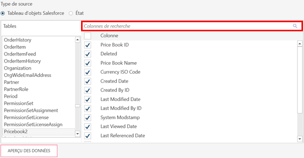 Notez que l’acquisition des états est limitée par Salesforce à 2 000 enregistrements de détail. Après avoir sélectionné le type de source, sélectionnez les données :