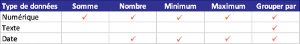 Si vous souhaitez que les données renvoyées soient regroupées, cochez la case Agréger dans l’en-tête, puis sélectionnez la méthode de regroupement que vous voulez utiliser pour chaque colonne. Les méthodes d’agrégation suivantes sont possibles pour chaque type de données :