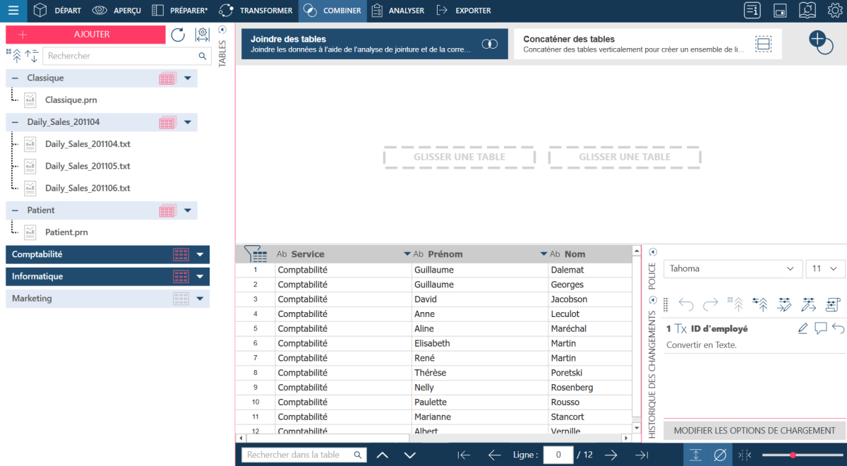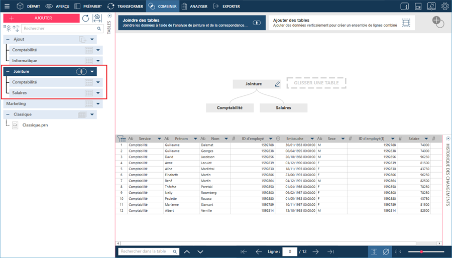 L’étape Combiner vous permet de créer des jointures à partir de deux tables en une seule session de jointure. Si vous souhaitez combiner les enregistrements de deux tables séparées, vous pouvez les joindre pour former une nouvelle table plus complète. Les jointures vous permettent de consolider vos données et d’offrir un affichage plus riche des informations qu’elles contiennent.