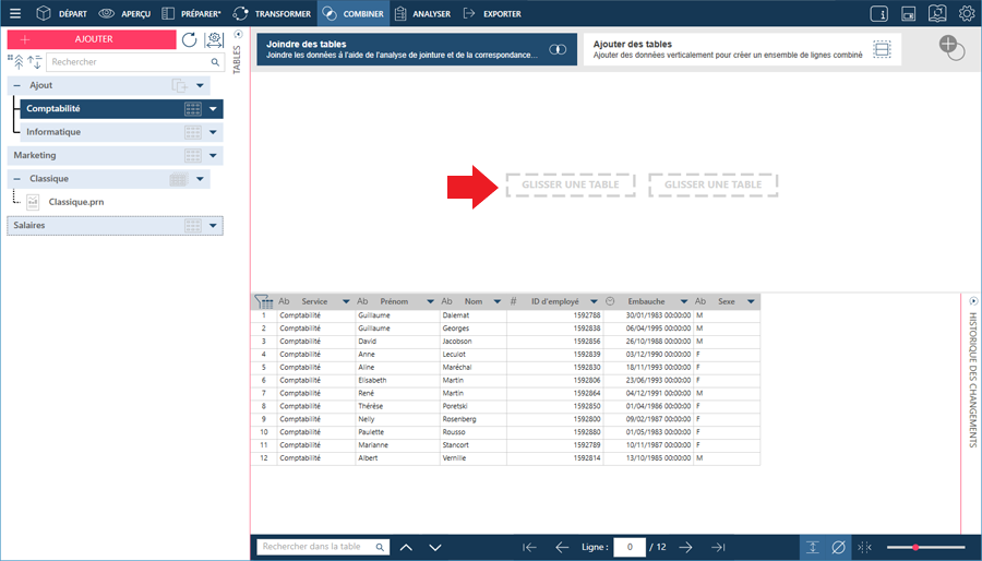 dans le coin supérieur droit de l’espace d’étape Combiner. Cette commande supprime toutes les tables déjà mises en place à l’étape de jointure, de même que la jointure définie précédemment, laissant l’espace libre pour la nouvelle création. Vous pouvez maintenant commencer à créer la jointure.