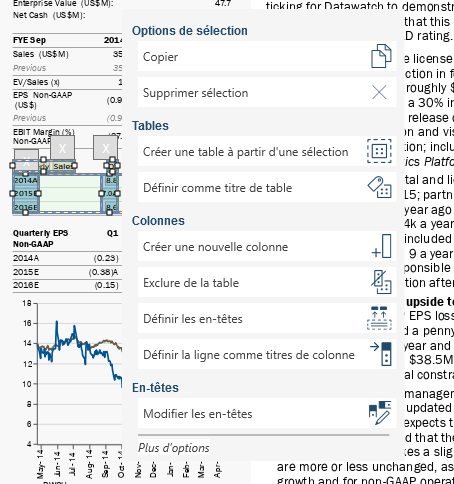 L’action Créer une table à partir d’une sélection est proposée dans le menu d’actions ou dans le menu contextuel.