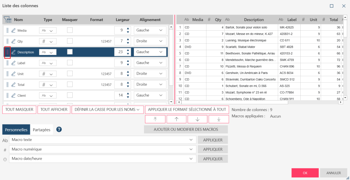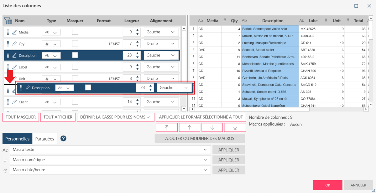 Déplacement d’une colonne via la boîte de dialogue Liste des colonnes