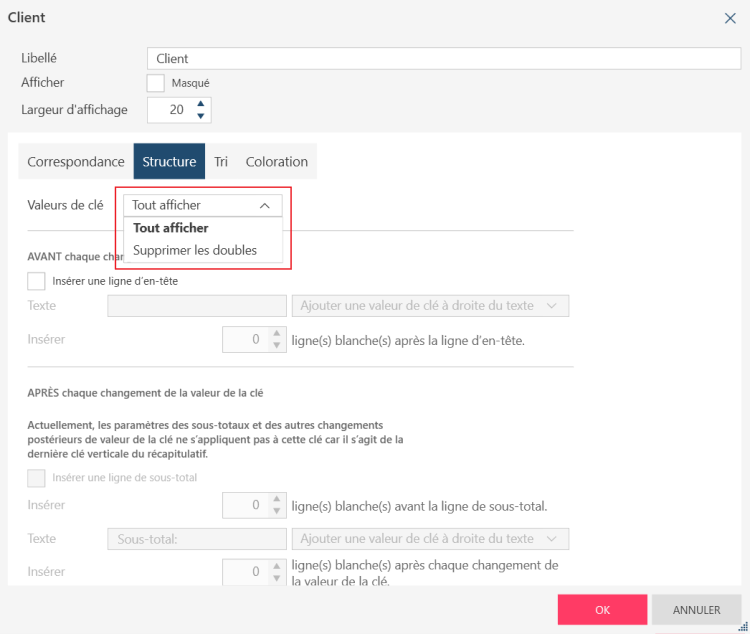 Dans l’onglet Mise en page, dans le menu déroulant Valeurs de clé, sélectionnez Supprimer les doubles.