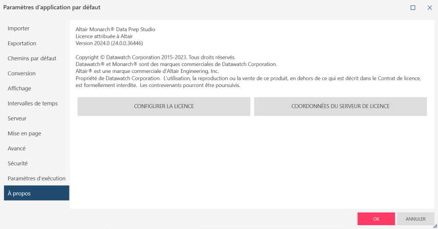 Affiche des informations pertinentes relatives à votre application Monarch Data Prep Studio, notamment le numéro de version et les avis de copyright d’Altair et de Datawatch.