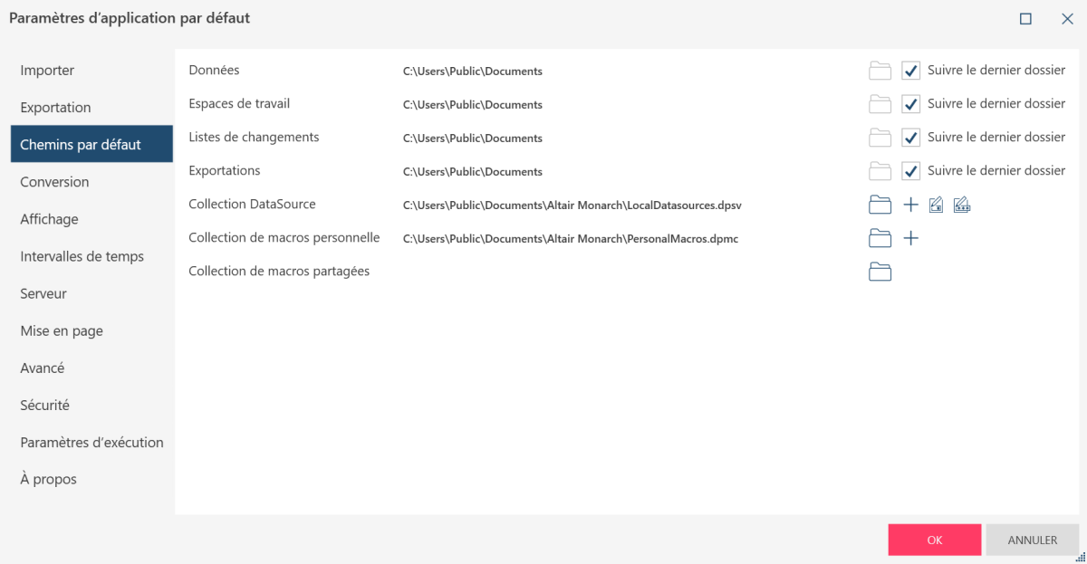 Les paramètres par défaut de l’application permettent de spécifier des paramètres d’espace de travail globaux pour Monarch Data Prep Studio. Chacun de ces paramètres est décrit en détail ci-dessous.