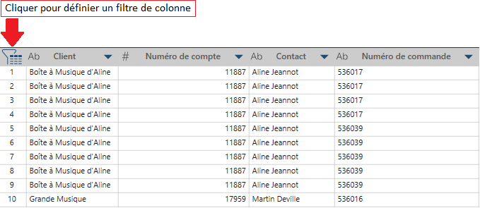 Si votre table est particulièrement large, vous pouvez filtrer des colonnes spécifiques à l'aide du contrôle de filtre de colonne. |