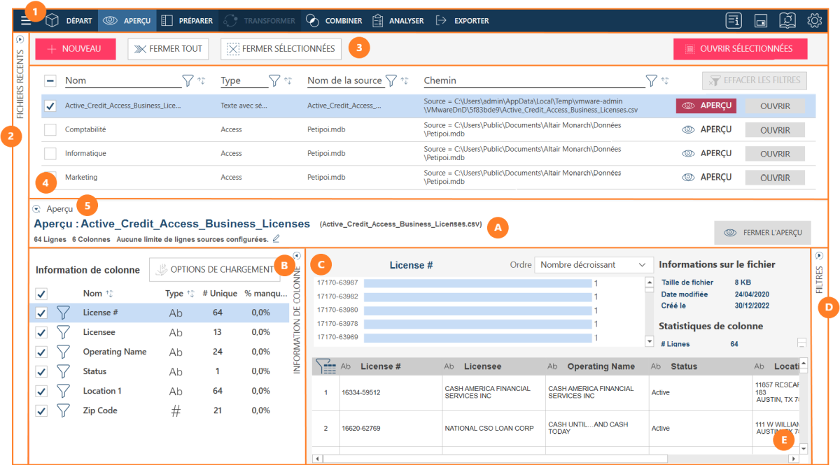Plusieurs panneaux s'affichent lorsqu'une table est prévisualisée.