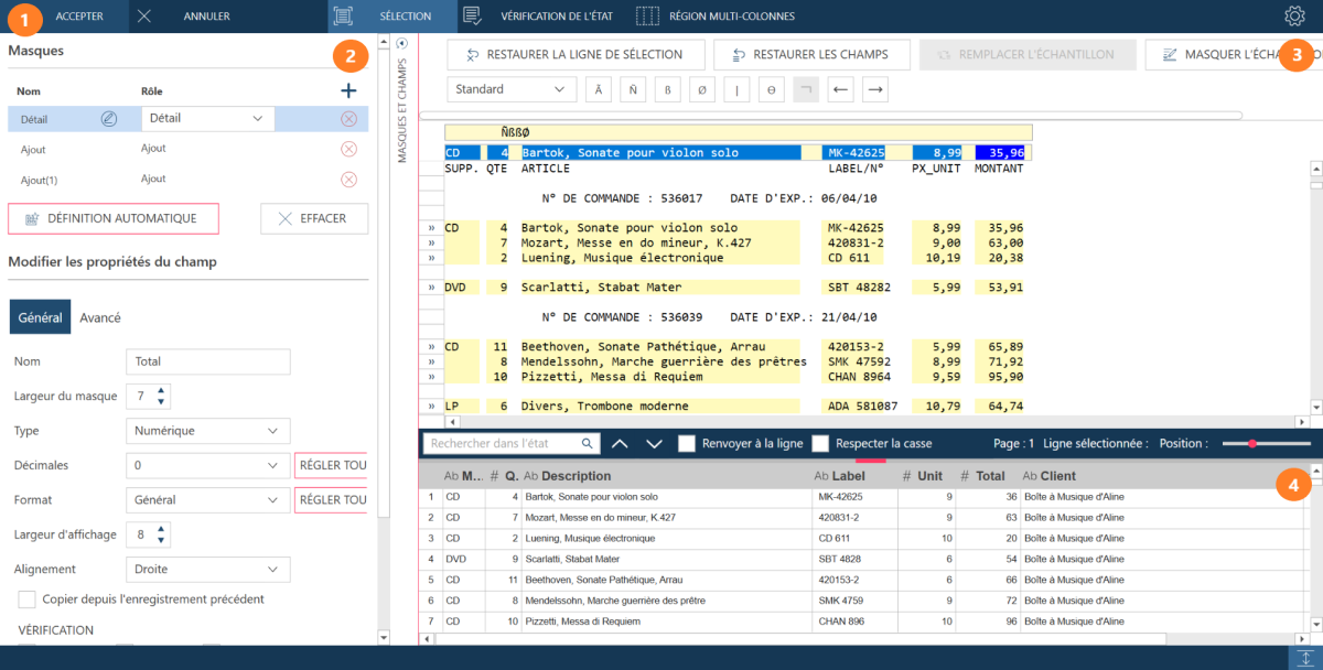 Panneau Propriétés du masque et du champ Affiche les propriétés de tous les masques et tous les champs définis. |