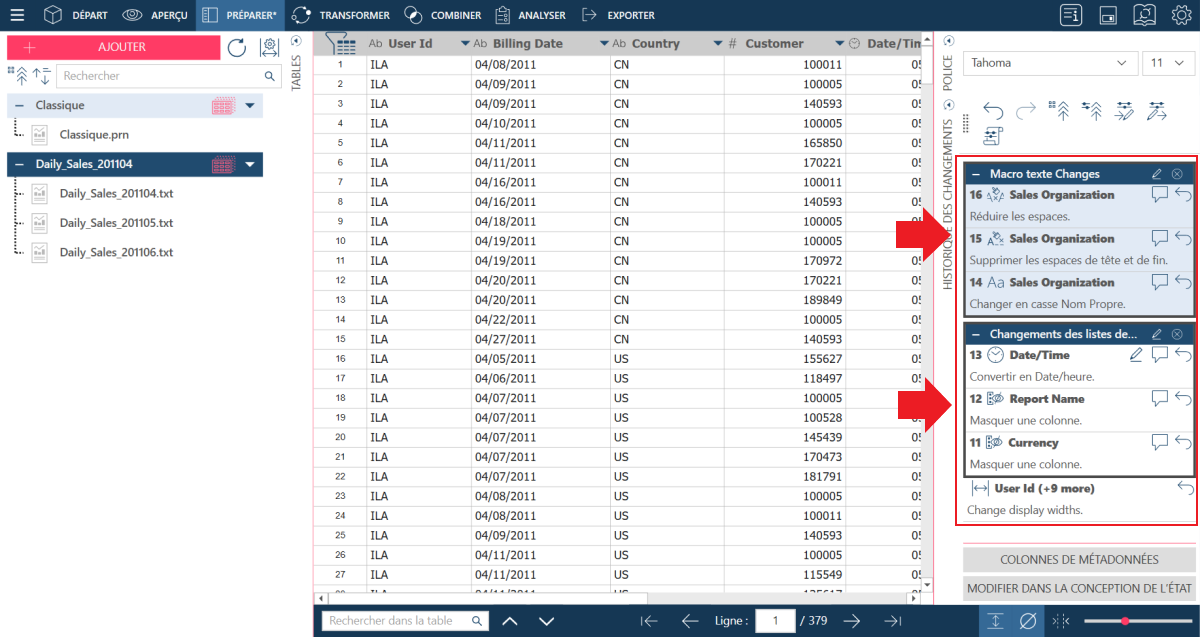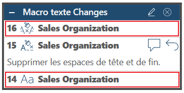 Par exemple, les changements associées à un modèle et à un état dans un projet créé dans Monarch Classic et ouvert dans Data Prep Studio seront regroupés en tant que changements « Monarch Import ». Lorsqu’une macro texte comporte plusieurs changements (par exemple, suppression des espaces en début et en fin de texte + passage en majuscules), ces changements sont regroupés sous l’appellation « Macro texte ». Autre exemple, tous les changements apportés à partir de la boîte de dialogue Liste des colonnes sont regroupés sous l’appellation « Changements de la liste des colonnes ».