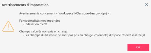 Le chargement dans l’application d’un projet/modèle contenant des éléments que Monarch Data Prep Studio ne prend pas en charge donne lieu à l’apparition d’une fenêtre d’avertissement.