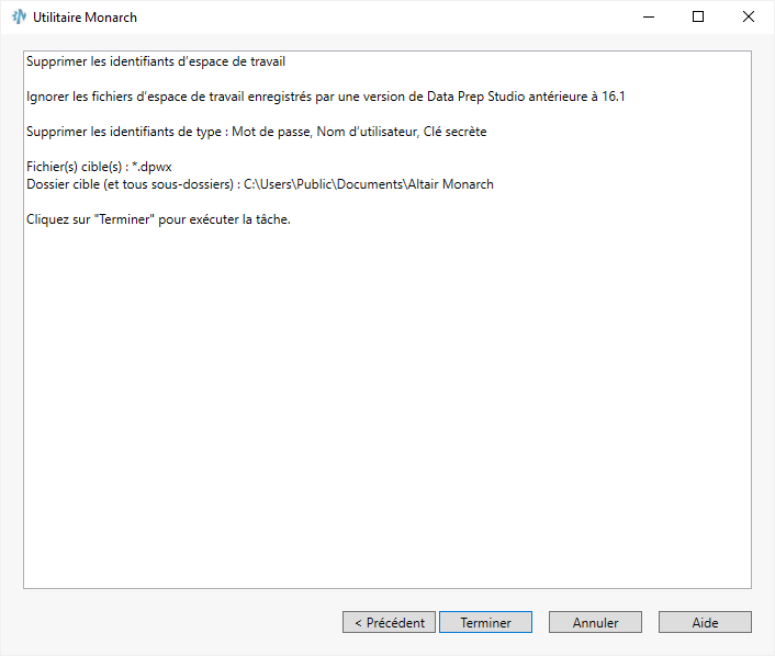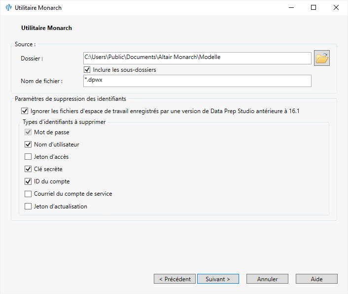 Dans Data Prep Studio, les espaces de travail peuvent inclure des sources de données nécessitant que vous saisissiez des identifiants comme des noms de connexion, des mots de passe et des jetons. Ces informations peuvent présenter un risque de sécurité, surtout si des utilisateurs non autorisés parviennent à accéder aux espaces de travail. L’Utilitaire Monarch peut supprimer tous ou certains identifiants sélectionnés des espaces de travail pour éviter toute fuite de données potentielle.