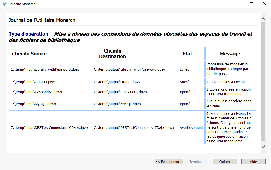 - Si l'état de la mise à niveau est « Avertissement » ou « Omis » et que le message correspondant indique la nécessité d'une intervention manuelle, vous pouvez ouvrir l'espace de travail dans Monarch Data Prep Studio et effectuer une mise à niveau manuelle.
