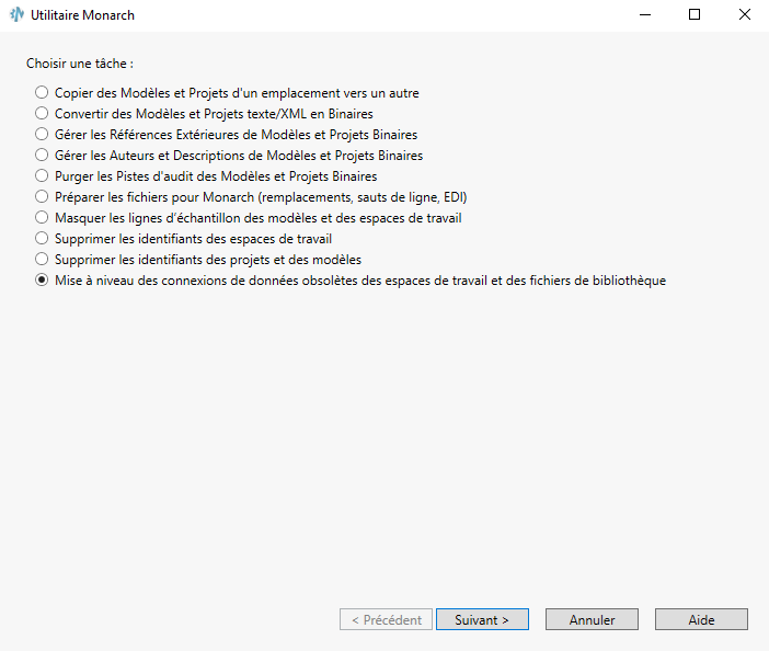 - Lancez Monarch Utility et sélectionnez Mettre à niveau les connexions de données obsolètes des espaces de travail et des fichiers de bibliothèque. Lorsque vous avez terminé, cliquez sur Suivant.