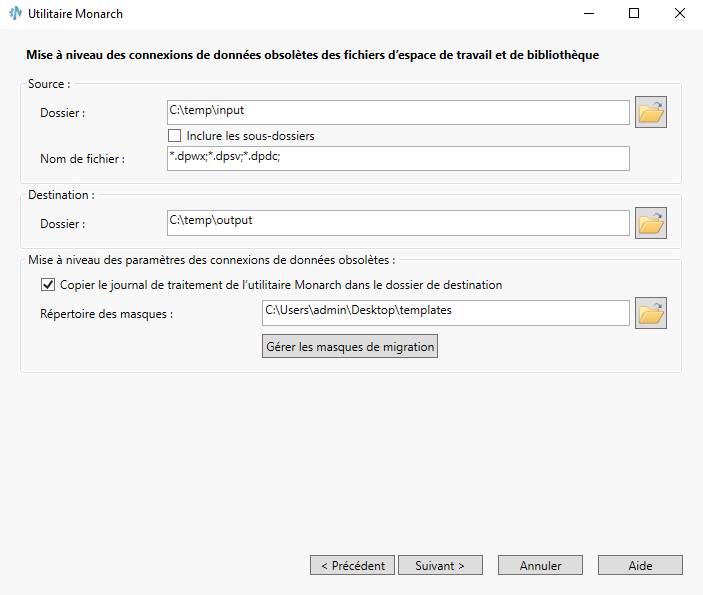 situé à côté de ce champ pour rechercher le dossier approprié. Cochez la case Inclure les sous-dossiers si vous souhaitez également mettre à niveau les connecteurs dans n'importe quel espace de travail ou fichier de bibliothèque existant dans tous les sous-dossiers. - Nom du fichier source – Nom de fichier de l'espace de travail ou du fichier de bibliothèque à mettre à niveau. Si le champ Nom de fichier est laissé tel quel (c'est-à-dire "*.dpwx, *.dpsv, *.dpdc"), Monarch Utility recherche les connexions obsolètes sur tous les espaces de travail et les fichiers de bibliothèque et les met à jour en utilisant les valeurs définies dans le masque.