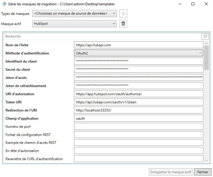 Le menu déroulant Type de masque fournit une liste des masques de migration possibles qui peuvent être créés pour un espace de travail ou un fichier de bibliothèque. Pour l'instant, il n'est possible de créer des masques que pour Active Directory, Google BigQuery, HubSpot, MySQL, NetSuite, OData, ServiceNow, SharePoint, SparkSQL et Cassandra. Notez que vous ne pouvez créer qu’un seul masque par connecteur. Si un modèle a été créé pour un certain connecteur, ce masque n'apparaît plus dans la liste Type de masque ; il est déplacé vers la liste Masque actif.