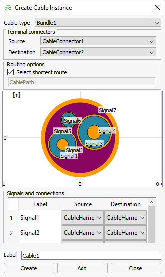Create a cable instance consisting of a single cable (for example, ribbon, cable bundle, coaxial cable) with its cable connectors that is routed along a cable path.