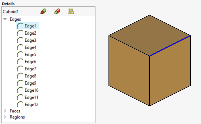 wire in the details tree. Conversely, selecting an edge or wire in the details tree selects the corresponding edge or wire in the 3D view.Figure 1. Select an edge in the 3D view to highlight the corresponding entry in