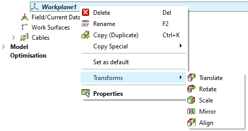 Note: Apply transforms on the workplane by selecting the workplane in the model tree. From the right-click context menu, click