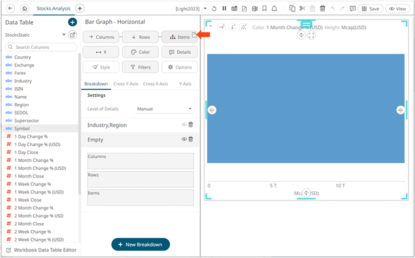 - To add more breakdown levels, drag text columns to the Items pill or drop area.