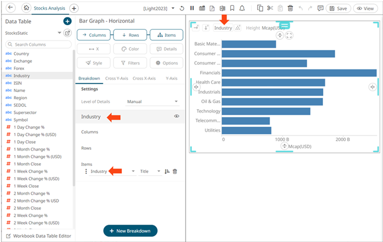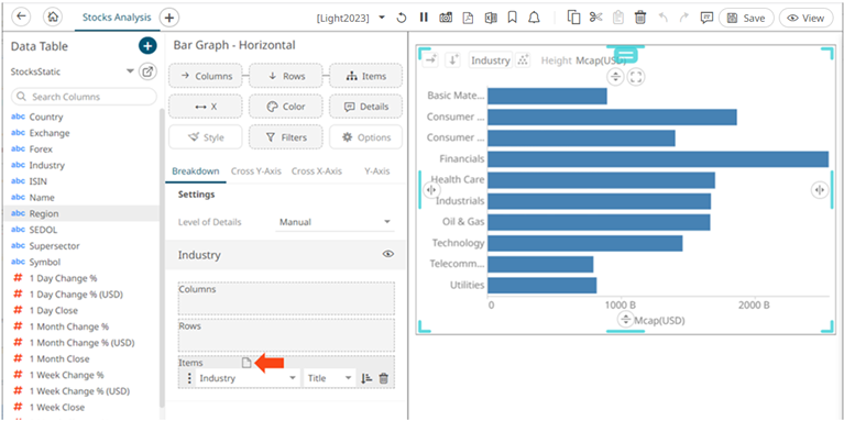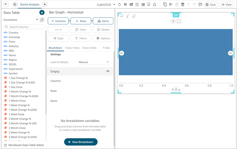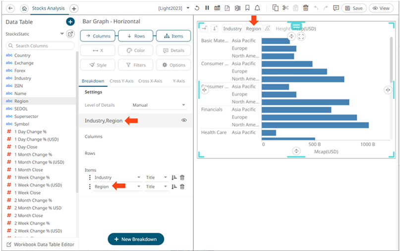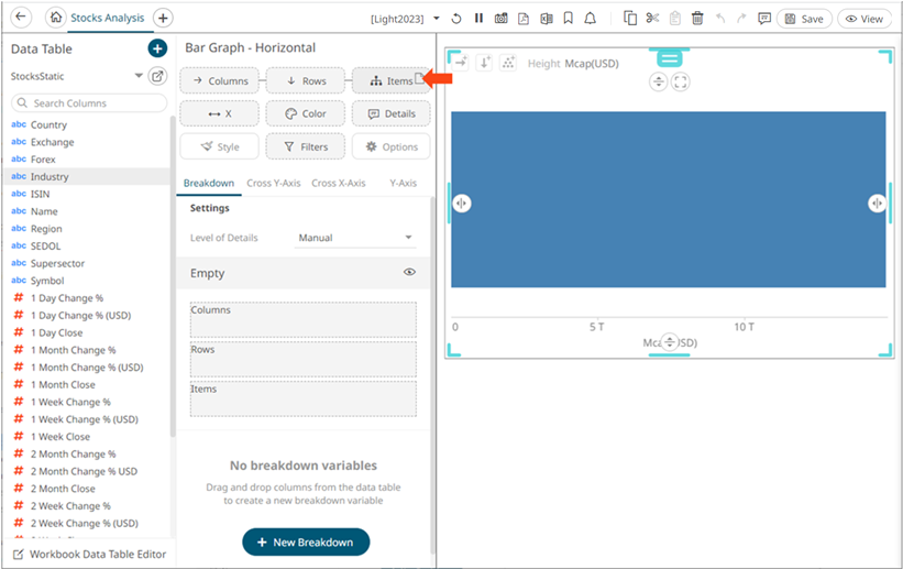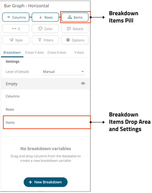 To add items to the breakdown, drag text columns from the Data Table pane to the Items variable or Items drop area under the Breakdown tab.